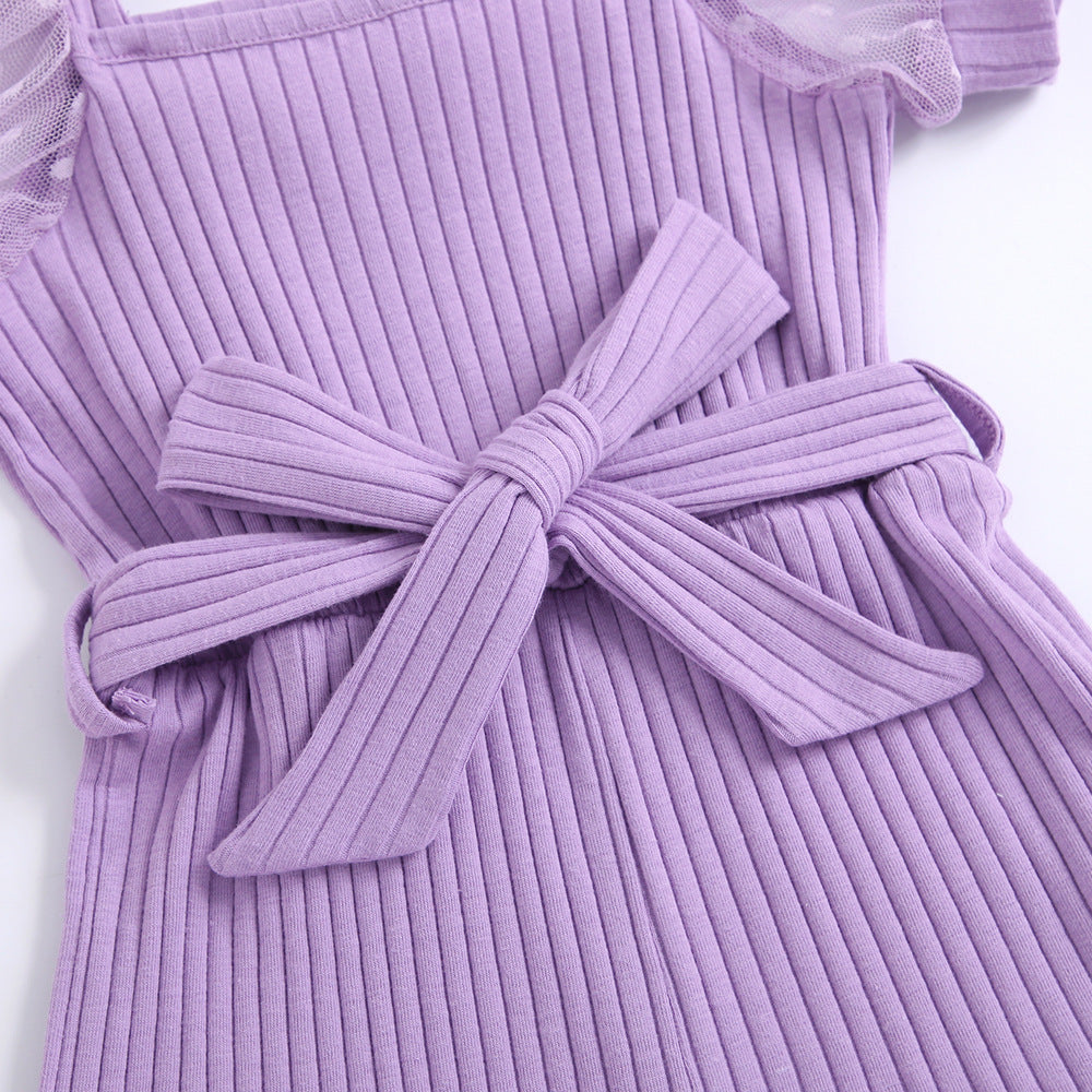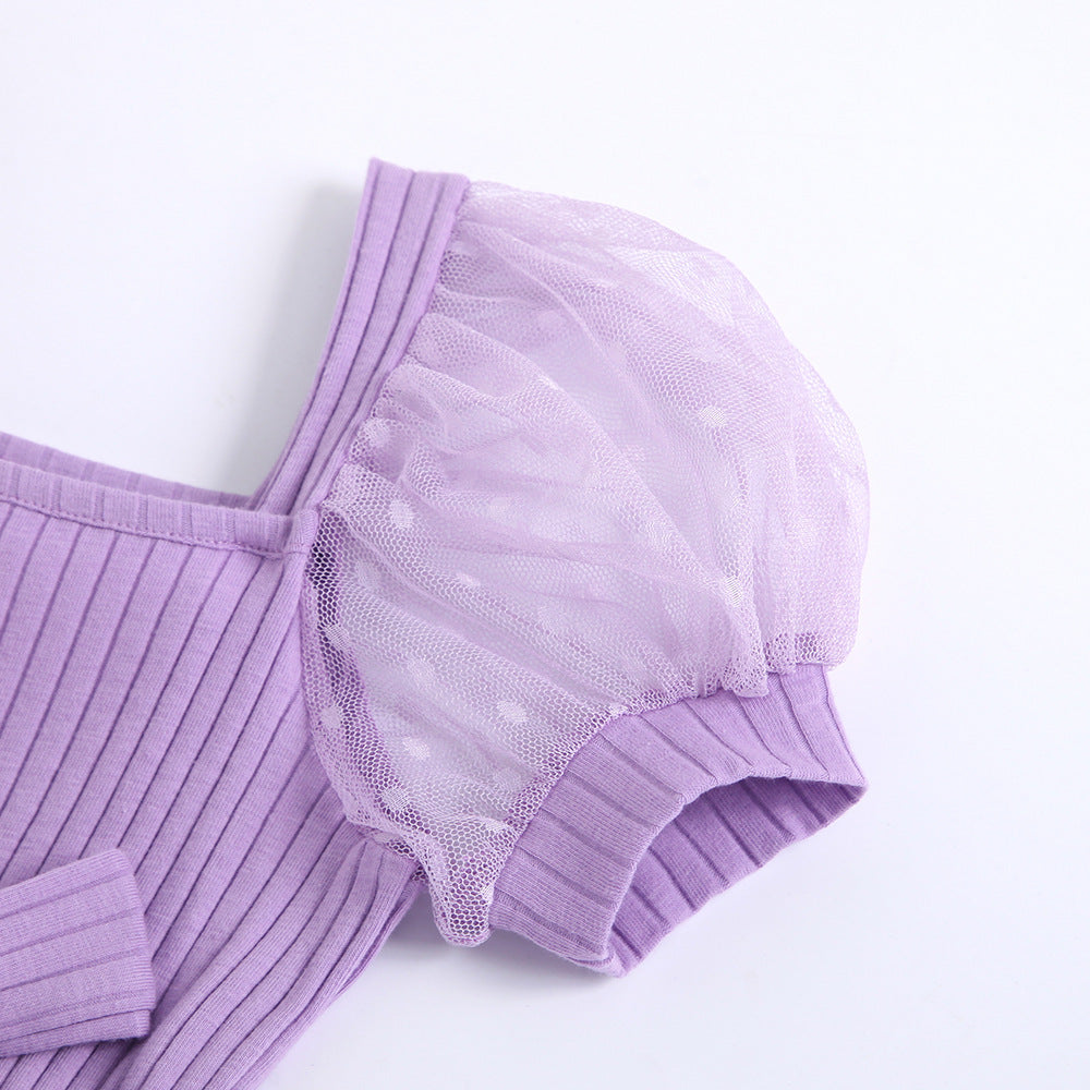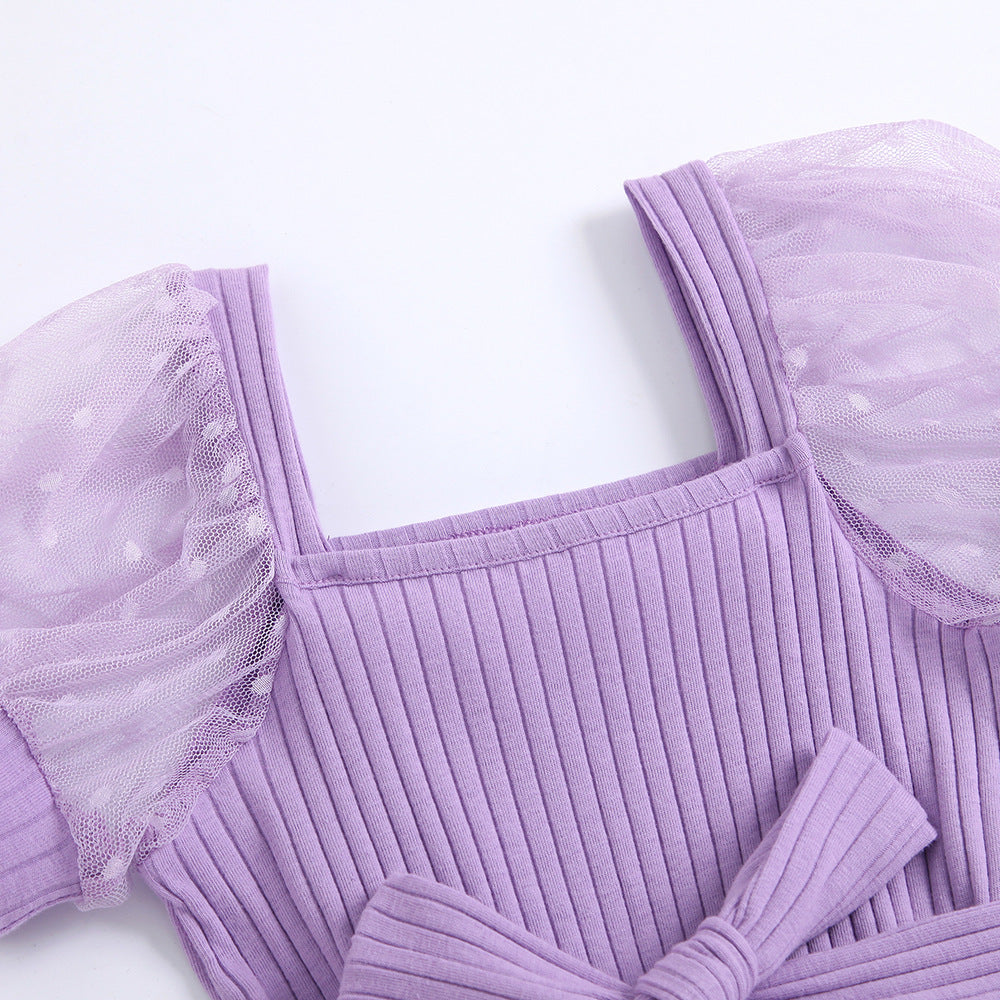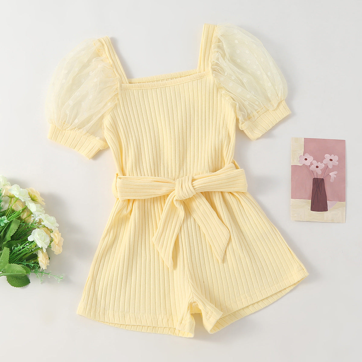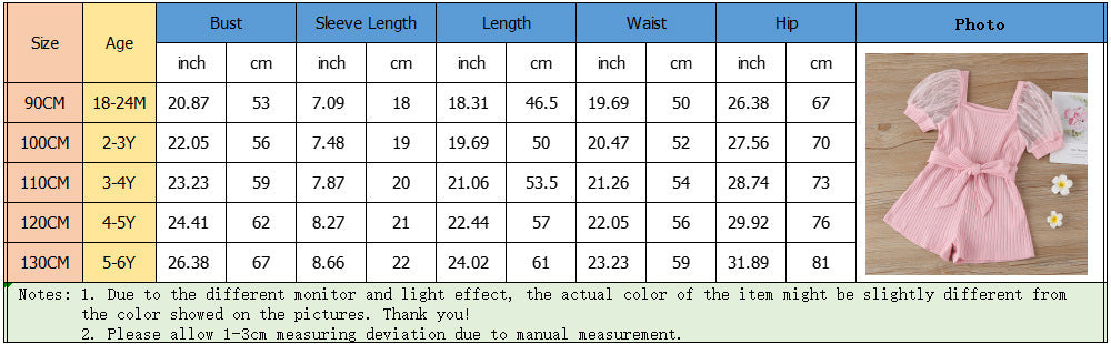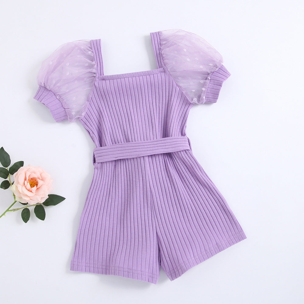 Children's Clothing Girls' Temperament Square Collar Transparent Puff Sleeve Jumpsuit With Belt