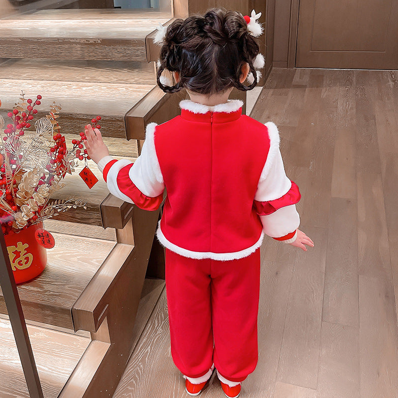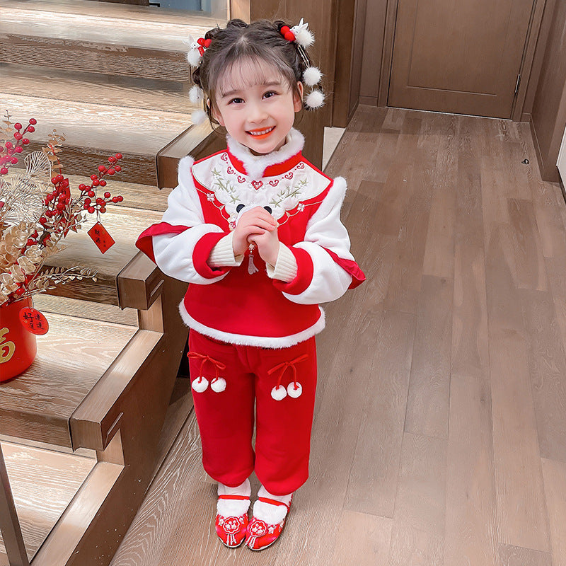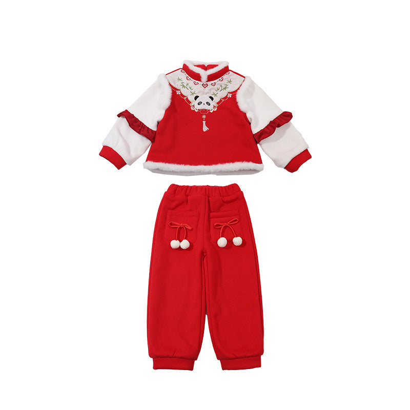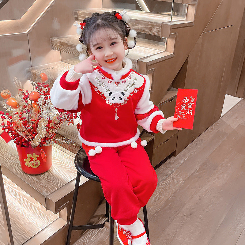 Girls' Cute Fleece-lined Thickened Panda Embroidered Annual Clothing Suit