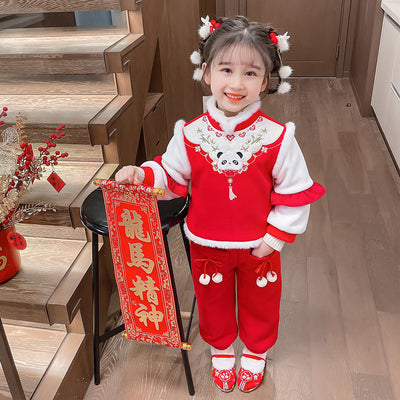 Girls' Cute Fleece-lined Thickened Panda Embroidered Annual Clothing Suit