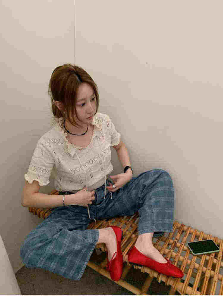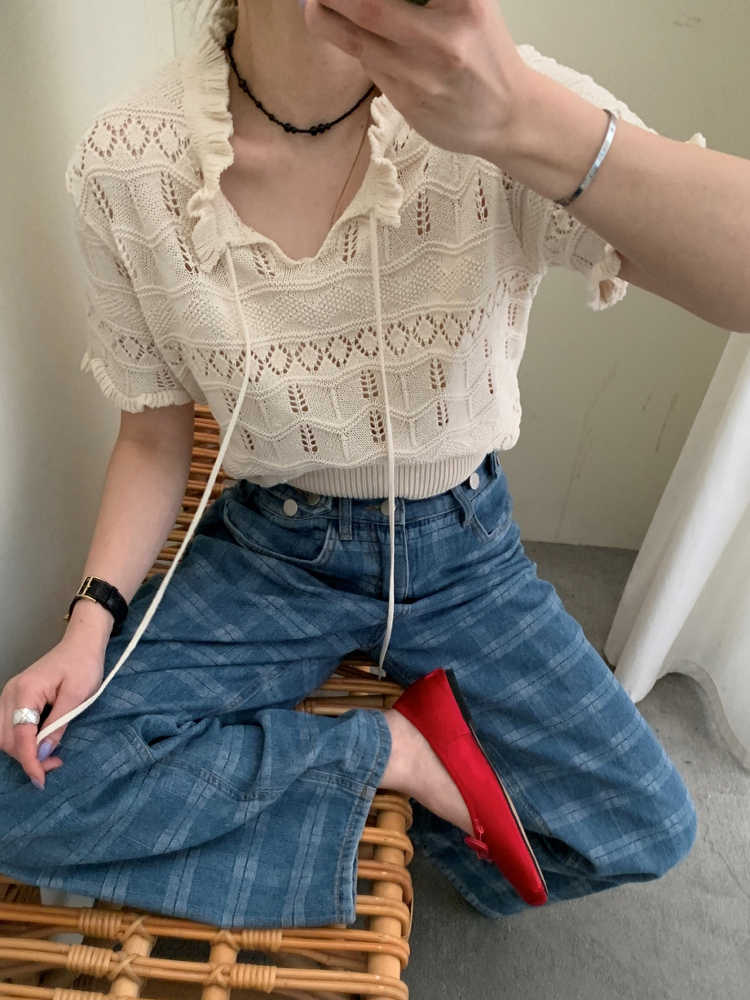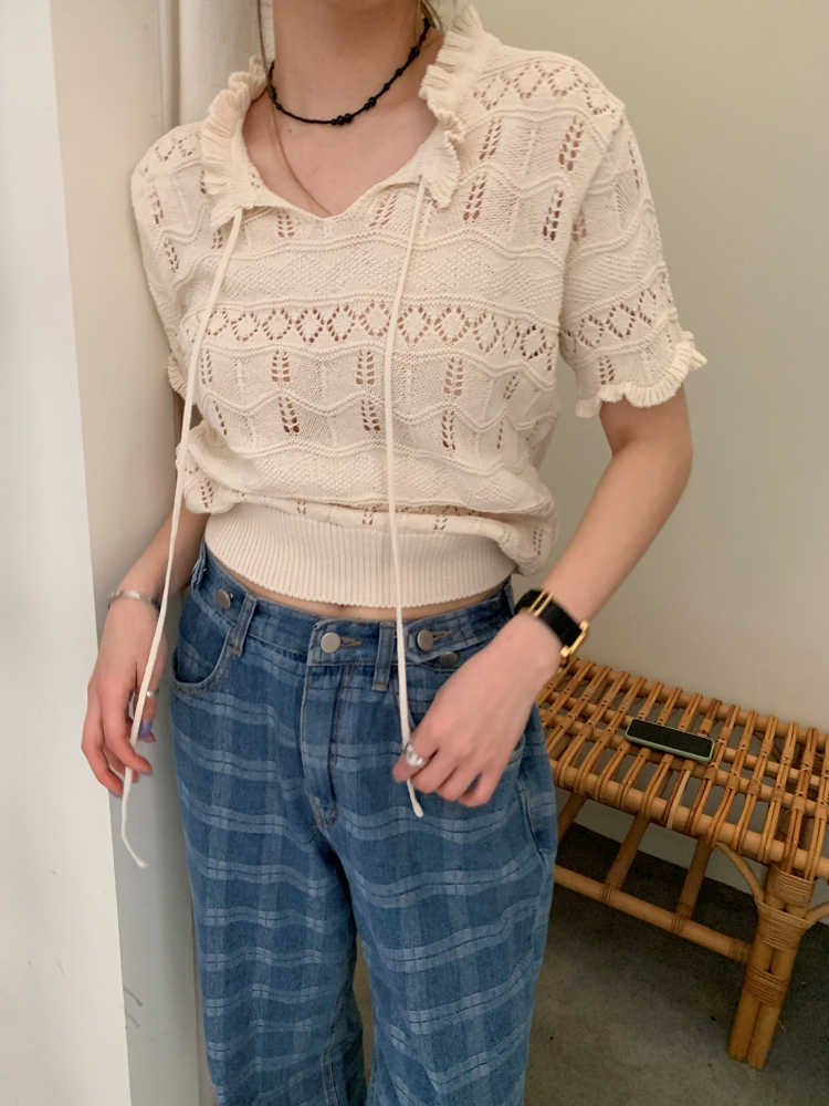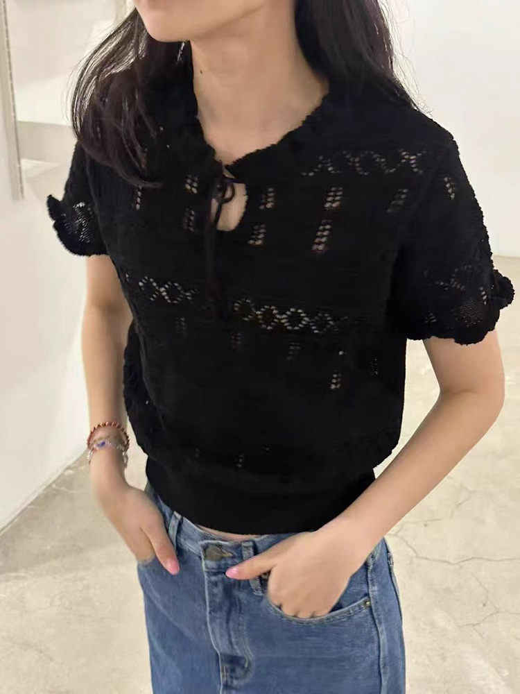 Hollow Stringy Selvedge Lace-up Knitted Top Women's T-shirt