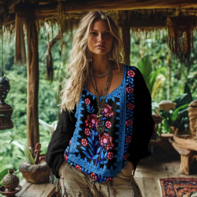 Women's Vintage Ethnic Floral Print Linen Long Sleeve Blouses