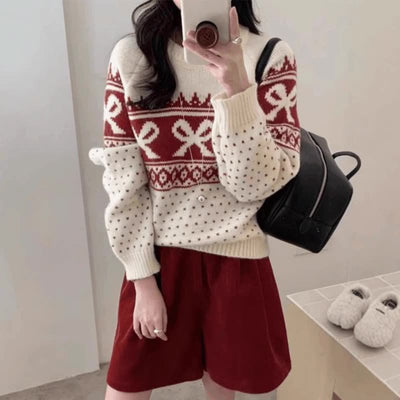 Women's Korean-style Vintage Jacquard Round Neck Sweater With Bow