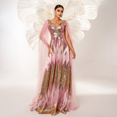 Mesh Long Sleeve V-neck Sequins Large Swing Evening Dress
